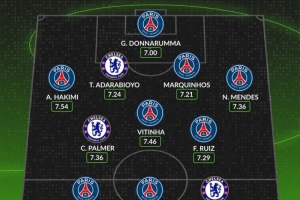 后衛(wèi):阿什拉夫(巴黎,7.54分)、阿達(dá)拉比奧尤(切爾西,7.24分)、馬爾基尼奧斯(巴黎,7.21分)、努諾-門德斯(巴黎,7.36分)