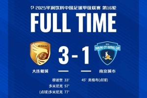 全場比賽結束,南京城市客場1-3不敵大連鯤城。