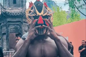他戴著獲贈的趙云戲劇面具在成都太古里逛街。