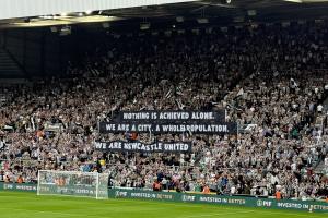 圣詹姆斯公園球場開賽初段,紐卡球迷通過展示橫幅營造出充滿敵意卻又熱烈的氛圍。橫幅上書:“偉業(yè)非一人可成,我們是一座城,是全體居民,我們是紐卡斯?fàn)柭?lián)?!?/p>