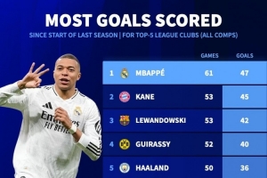 據(jù)德國轉(zhuǎn)會市場統(tǒng)計,姆巴佩加盟皇馬以來攻入47粒進球,五大聯(lián)賽球員同期最多。