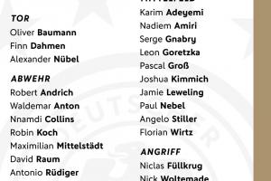 中場(chǎng):阿德耶米(多特)、阿米里(美因茨)、格納布里(拜仁)、格雷茨卡(拜仁)、格羅斯(多特)、基米希(拜仁)、勒威林(斯圖加特)、內(nèi)布爾(美因茨)、斯蒂勒(斯圖加特)、維爾茨(利物浦)