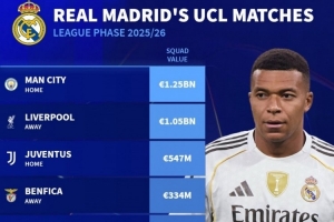 體育資訊8月29日訊 本賽季歐冠聯賽階段對陣抽簽結果出爐,德國轉會市場列出了皇馬對手的身價。