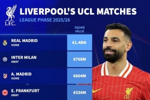 體育資訊8月29日訊 本賽季歐冠聯(lián)賽階段對陣抽簽結(jié)果出爐,德國轉(zhuǎn)會市場盤點了利物浦對手的身價。