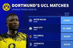 體育資訊8月29日訊 本賽季歐冠聯(lián)賽階段對陣抽簽結(jié)果出爐,德國轉(zhuǎn)會市場盤點了多特對手的身價。