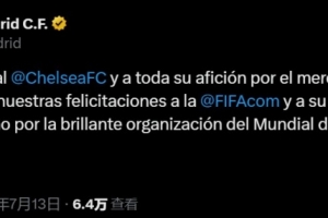 體育資訊7月14日訊 在切爾西3-0擊敗巴黎奪得世俱杯冠軍后,皇馬第一時(shí)間通過社交媒體表達(dá)了祝賀。