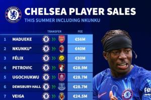 據(jù)德轉(zhuǎn)統(tǒng)計,切爾西今夏賣人總收入將達到3.165億歐元,冠絕全球,比賣人榜第二位的伯恩茅斯多了近8000萬歐元。