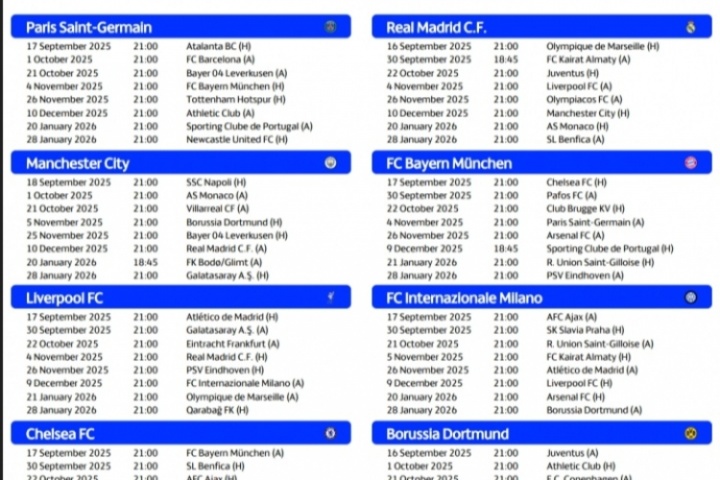 體育資訊08月30日訊 歐足聯(lián)官方公布?xì)W冠聯(lián)賽階段賽程,歐冠正賽聯(lián)賽階段共36隊,每支球隊進(jìn)行4主4客8場比賽。聯(lián)賽階段結(jié)束后,前8名直接晉級淘汰賽,第9名-第24名將參加淘汰賽附加賽,具體對陣由抽簽決定。