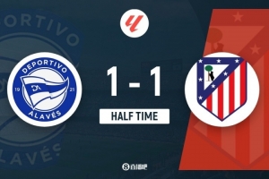 上半場比賽結(jié)束,馬德里競技客場暫時1-1戰(zhàn)平阿拉維斯。