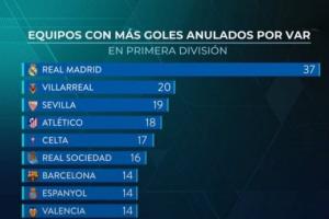 賽后皇馬官方電臺(tái)曬出圖標(biāo),統(tǒng)計(jì)西甲被VAR取消的進(jìn)球排名,其中皇馬有37球被VAR取消,大幅領(lǐng)先排名第二的比利亞雷亞爾。