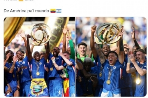 南美足聯(lián)社媒曬出恩佐、凱塞多舉杯的照片,配文:“凱塞多、恩佐,從美洲走向世界?!?/p>