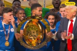 賽后頒獎(jiǎng)儀式上,切爾西準(zhǔn)備捧杯之際,特朗普一直站在中間。切爾西球員桑切斯對(duì)其說了幾句話,因凡蒂諾也向其示意。