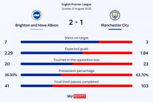 下一篇: 布萊頓2-1曼城全場(chǎng)數(shù)據(jù):射門12-12,射正7-3,控球率36%-64%