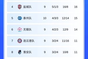 積分榜后三位分別為揚(yáng)州積7分排名第11,常州隊(duì)積5分排名第12,鎮(zhèn)江隊(duì)積3分排名倒數(shù)第一。