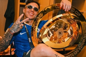 恩佐社媒曬出自己戴著墨鏡與世俱杯獎杯的合照,配文:“切爾西!世界冠軍??????”