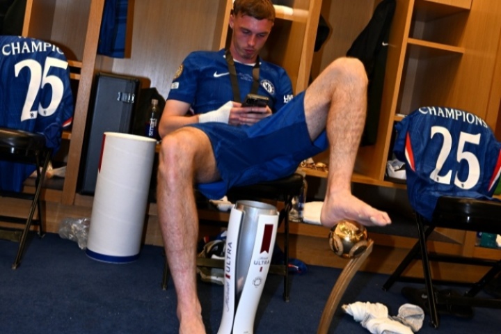 更衣室內(nèi),球員坐姿慵懶,腳踩世俱杯金球獎(jiǎng),胯下MVP獎(jiǎng)杯,一如既往的“帕爾默風(fēng)格”。