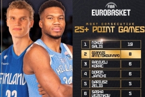 據(jù)統(tǒng)計,字母哥在歐錦賽已經(jīng)連續(xù)8場得分25+,歷史第二長,第一長的是希臘傳奇加利斯(連續(xù)19場)。