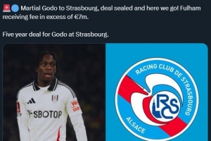 “富勒姆將獲得超過700萬歐元的轉會費,戈多與斯特拉斯堡簽約五年?!?/p>