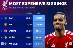 體育資訊9月2日訊 利物浦壓哨簽下今夏標(biāo)王伊薩克,《轉(zhuǎn)會市場》也統(tǒng)計(jì)了紅軍隊(duì)史最貴買人情況,前三均為今夏新援。