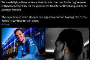 “我們非常高興地宣布,俱樂部已與曼城就巴西門將埃德森的永久轉(zhuǎn)會達(dá)成協(xié)議。這位經(jīng)驗豐富的門將已與我們簽署了一份3+1合同?!?/p>