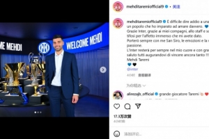 “國際米蘭將永遠(yuǎn)留在我心中。帶著感激之情,我向你們所有人告別,并祝愿你們未來贏得更多榮譽!滿懷感情地這么做?!泛盏?塔雷米。”