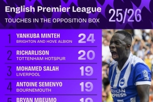 本賽季英超在對(duì)方禁區(qū)觸球次數(shù)榜: