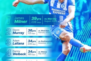 米爾納在對陣曼城的比賽中破門,以39歲239天成為布萊頓英超最年長進球者。