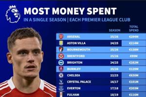 阿森納、伯恩茅斯、布倫特福德、伯恩利、利物浦、曼聯(lián)、紐卡、諾丁漢森林、桑德蘭共9支球隊(duì)都已創(chuàng)造了各自球隊(duì)單賽季引援花費(fèi)的歷史紀(jì)錄。