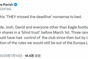 帕里什社媒駁斥“水晶宮錯過改變股權(quán)最后期限”的說法,他寫道:“讓我們來終結(jié)‘他們錯過了最后期限‘的無稽之談?!?/p>