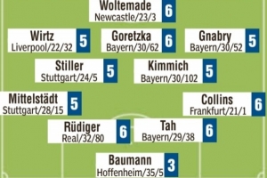 首發(fā):沃爾特馬德6分、維爾茨5分、格雷茨卡6分、格納布里5分、斯蒂勒5分、基米希5分、米特爾施塔特5分、呂迪格6分、若納坦-塔6分、納姆迪-科林斯6分、鮑曼3分