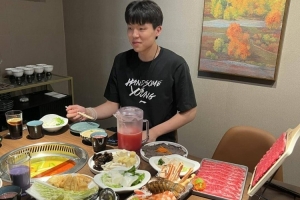 可以看到,楊瀚森的餐桌前擺放著豐盛的餐食,有牛肉、蝦、毛肚、青菜等,火鍋搭配烤肉。