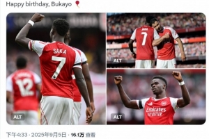 阿森納官方社媒曬出薩卡的照片,配文:“我們的7號(hào),生日快樂,布卡約(薩卡)!”