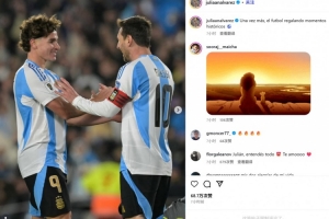 阿爾瓦雷斯在賽后也曬出他和梅西的慶祝照,并配文:“又一次,足球奉上了歷史性時刻?!?/p>