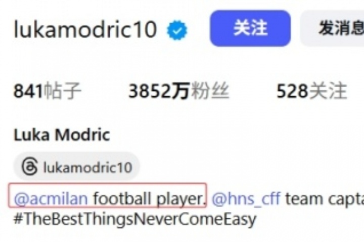 莫德里奇此前的個(gè)人簡介為皇馬球員,在加盟AC米蘭后,莫德里奇已經(jīng)將自己的社媒簡介改為了AC米蘭球員。