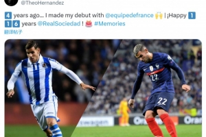 特奧社媒曬出自己身穿法國(guó)隊(duì)和皇家社會(huì)球衣的照片,配文:“4年前的今天,我在法國(guó)隊(duì)上演首秀。?;始疑鐣?huì)116歲生日快樂!”