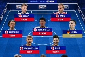 中場:格拉利什(英格蘭,2800萬歐元)、霍爾(英格蘭,2000萬歐元)、貝林厄姆(英格蘭,1.8億歐元)、賴斯(英格蘭,1.2億歐元)、內(nèi)貝爾(德國,2400萬歐元)