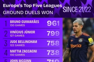 體育資訊9月11日訊 Squawka統(tǒng)計(jì)了2021-2022賽季以來(lái)球員在五大聯(lián)賽地面對(duì)抗成功的次數(shù),并列出榜單,吉馬良斯961次居首,維尼修斯、貝林厄姆二三位。