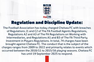 英格蘭足球總會今日對切爾西足球俱樂部提出指控,其違反《英足總足球經(jīng)紀人條例》J1和C2條款、《英足總中介合作條例》A2和A3條款,以及《英足總第三方球員投資條例》A1和B3條款。切爾西俱樂部共面臨74項指控,涉及2009年至2022年期間的違規(guī)行為,主要集中于2010/11至2015/16賽季期間。切爾西俱樂部需于2025年9月19日前就此作出回應。