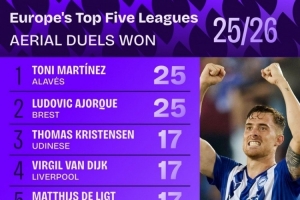體育資訊9月12日訊 Squawka統(tǒng)計(jì)了本賽季球員在五大聯(lián)賽的爭(zhēng)頂成功次數(shù),并列出榜單。