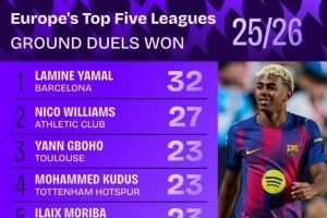 本賽季五大聯(lián)賽地面對抗成功排名: