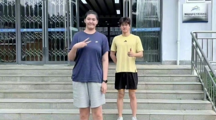 體育資訊9月14日訊 近期,中國游泳隊和中國女籃在昆明海埂基地集訓時,潘展樂(1米92)和張子宇(2米26)同框上演最萌身高差。