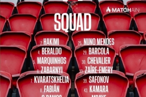 后衛(wèi):2-阿什拉夫、4-貝拉爾多、5-馬爾基尼奧斯、6-扎巴爾尼、21-盧卡斯-埃爾南德斯、25-努諾-門德斯、43-諾哈姆-卡馬拉、51-帕喬
