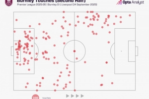 據(jù)統(tǒng)計(jì),伯恩利在本場比賽下半場沒有一次在利物浦禁區(qū)內(nèi)觸球,而利物浦則有41次對(duì)手禁區(qū)觸球,最后一次就是薩拉赫的點(diǎn)射絕殺。
