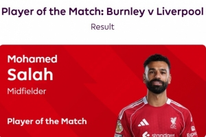 本場比賽薩拉赫在補(bǔ)時階段打進(jìn)點(diǎn)球絕殺,賽后也當(dāng)選英超官方球迷票選全場最佳球員。