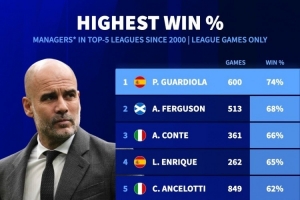 體育資訊9月15日訊 德國(guó)轉(zhuǎn)會(huì)市場(chǎng)統(tǒng)計(jì)了本世紀(jì)五大聯(lián)賽教練的聯(lián)賽勝率,并列出榜單,瓜迪奧拉執(zhí)教600場(chǎng),取勝446場(chǎng),勝率74%居首。