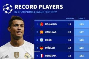 體育資訊09月16日訊 今夜,新賽季歐冠就將打響。德轉(zhuǎn)在賽前列出了歐冠歷史出場榜,C羅以183場位列榜首,卡西、梅西分列二三。