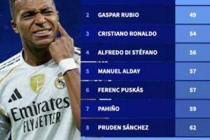 姆巴佩打進50球用了64場比賽,在皇馬隊史排名第9。