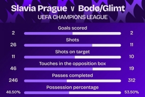 此役布拉格斯拉維亞射正11次,博德閃耀射正10次。據(jù)Squawka統(tǒng)計(jì),這是近10個(gè)賽季第3場(chǎng)雙方都射正10+的歐冠比賽,前2場(chǎng)為2017年萊比錫vs貝西克塔斯、2020年薩爾茨堡vs拜仁。