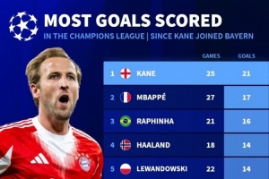 凱恩加盟拜仁以來(lái)歐冠進(jìn)球榜: