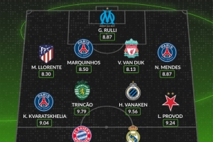 中場(chǎng):克瓦拉茨赫利亞(巴黎,9.04分)、特林康(葡體,9.79分)、瓦納肯(布魯日,9.56分)、盧卡斯-普羅沃德(布拉格斯拉維亞,9.24分)